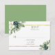 Vattenfärgad succulent i gröntens nyanser med vita blommor med guld linjer överst och grund. Kortets baksida är vår grönt.