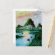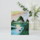 en traditionell vattenfärgsmålning av gröntens berg framför en djungel av sjö och grönt under en färgstark solnedgång på ett vykort