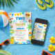 💦☀️ Make waves with this bright and playful “Two the Beach” Birthday Invitation — perfect for celebrating your little guy’s second birthday in fun, sunny style! Featuring cheerful watercolor beach elements like rubber ducks, pool floats, palm trees, a smiling sun, and colorful bunting, this design is bursting with vibrant summer colors including aqua blue, sky blue, leafy green, sunshine yellow, and bright orange.