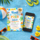 💦☀️ Make waves with this bright and playful “Float into Four” Pool or Beach Party Birthday Invitation — perfect for celebrating your little guy’s fourth birthday in fun, sunny style! Featuring cheerful watercolor beach elements like rubber ducks, pool floats, palm trees, a smiling sun, and colorful bunting, this design is bursting with vibrant summer colors including aqua blue, sky blue, leafy green, sunshine yellow, and bright orange.