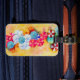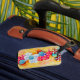 Färgfulla sol-paraplyer i sanden på stranden, du kärlekar bagagetaggen som gör det enkelt att upptäcka ditt bagage. MATCHING-objekt i vår butik.