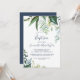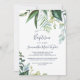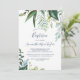 Den här sommarens storslagna baptisminbjudan är perfekt för en elegant för ett engagemang i baby under sommaren. Den botaniska designen har en lush arrangemang av färgade löv av eukalyptus, grey och grönt.