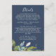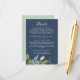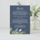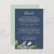 Kortet för den gröna marinen i marinen är perfekt för en elegant mitt i sommaren bröllop. Den botaniska designen har en lush arrangemang av färgade löv av eukalyptus, grey och grönt med subtila sprickor av blommar vid rosa mot en marin blå bakgrund.