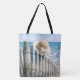 A woman's summer straw hat with a white ribbon hangs on a wooden fence by the shore, while the ocean waves softly kiss the sandy beach under a clear sky