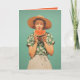 En glad kvinna i en soppa och en blommigt skjorta har en del vattenmelon mot en pulserande tealbakgrund, som fångar en perfekt av sommartid lycka.