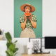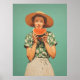 En glad kvinna i en soppa och en blommigt skjorta har en del vattenmelon mot en pulserande tealbakgrund, som fångar en perfekt av sommartid lycka.