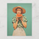 En glad kvinna i en soppa och en blommigt skjorta har en del vattenmelon mot en pulserande tealbakgrund, som fångar en perfekt av sommartid lycka.