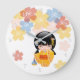 Vektorillustration av en söt, oriental flicka i en ljus gult kimono-klänning med brett obi-streck med en blå kinchaku-dragsträngspåse. Flickans svarta hår är dekorerat med blommor och geisha stil hårnålar. Denna teckning inspirerades av Japans traditionella kokeshi-dockor och påverkades av japanska Chibi Kawaii art stil. Stora, färgstarka blommor som är formade som Sakura-blommar gör en enkel bakgrund.