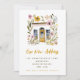 Announce your summer house move with is colorful new address/new home announcement with a watercolor illustration of a mustard yellow from door surrounded by mustard yellow and pink flowers and greenery.