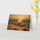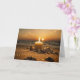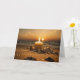 Sommarsolkort med och bild av kusten i skymningen på årets längsta dag. Ett ljus tänds på sandstranden med sten och säljs som solnedgången på havet vid Midsommarens kväll