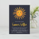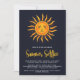 Modern Sommar Solstice Party-inbjudan. Utformningen har en sjudande sol-ikon i gult och orange färg med ljusa, strålande sol-strålar som ställs in mot en djup marin bakgrund. I typografin kombineras ett snyggt för "Sommarsolstice" med trendigets huvudtext för detaljerna i party, vilket skapar en contemporary- och öga-fångstinbjudan.