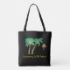 Mosaik, grafisk teckning, av en ö, med två, kokokokosnöt träd, och hut, med frasen "Summering i Tropikernorna"-i färg av; grönt, gult, turkos, blått, taupe, brun och svart.