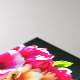 A young woman with auburn hair wears a vibrant flower crown and round sunglasses. Hummingbirds flit nearby.