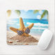 En stjärnfisk med en polkapunktbikini-toppar som delvis begravts i sand under handflatan träd grenar, med ett serenhav och ett starkt himmel i bakgrunden