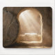 An empty tomb carved from stone is illuminated by rays of light filtering through the entrance, with a burial shroud lying on a ledge inside
