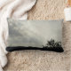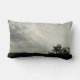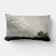 Den här lumbalkudden har ett foto som fångar upp ett kvällslandskap med sol-strålar som går genom grått och vita moln. Marken visas i svart silhuett tillsammans med grenar i ett avlägset träd. Solstrålarna skapar diagonalt linjer över det tvåtonliga himlar.