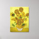 Solblommor av Vincent Van Gogh, olja på canvas 1889, är fortfarande en levande målning av femton briljant färgade solblommor i ett stort vas mot en sur gult bakgrund. En rad varma gulter och orange kontrast med coola, som avgränsas av mörkens accenter och feta, ihärdiga konturer, för en effekt av plattade former som fångar blommornas innerliv i vas. Van Gogh målade sina ikoniska solblommor som en serie målningar för sin Gult House i Arles, Frankrike, där målaren Paul Gauguin också levde och arbetade under en kort tid. Vincent Van Gogh (1853-1890) var en nederländsk målare för den post-Impressionistiska rörelsen som var känd för djärvt, uttrycksfullt teckning, snurrande penseldrag och intensivt, förhöjt färg. I tidigt arbetade adulthood Van Gogh som konsthandlare, lärare och pastor innan han påbörjade fullt-tidsstudien av teckning och målade i sitt sena tjugoårsålder. Influenserad av Rembrandt, 1800-talets realister- och Barbizonsskola, hade Van Goghs målningar i tidigt inneburit studier av arbetare och bönder i somberiska jordtoner. Flyttan till Frankrike 1886 mötte Van Gogh de häpnadsväckande nyheterna hos de intsionistiska målarna och började tillämpa sin strategi på färg och subjekt, som fortsatte in i det mogna stil som konstnären är mest känd för. Van Gogh producerade hundratals teckning och målningar, bland annat porträtt, landskap, stillahavs- och blommålningar, och ett stort antal självständiga porträtt som blev en dominerande kraft på 1900-talets moderna konst och gjorde honom till en av de mest populära konstnärerna av hela tiden.
