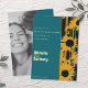 Announce your wedding date with this bold modern teal blue and gold sunflower save the date card. The striking design features artistic sunflower silhouettes with integrated teal accents and luxe striped patterns on the front, with your engagement or pre-wedding photo on the back. Simply upload your favorite photo to create a personalized announcement that's uniquely yours. Perfect for couples seeking a contemporary alternative to traditional calligraphy and floral designs. Fully customizable with your names, date, and location details. Ideal for coastal, outdoors, country, or contemporary weddings with a fresh and elegant aesthetic. Part of a complete collection including invitations, save the dates, thank you cards, RSVPs, and matching wedding décor.