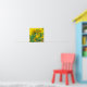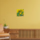A lush bouquet of sunflowers is depicted in vivid colors. The setting is lively with thick brushstrokes and a bright yellow background.