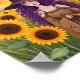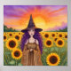 Den här vita poster har ett sjudande solrosblomma fält med ett vänligt väska som njuter av den vackra solnedgången i avstånd. Avslutat i ett vattenfärgstryck.