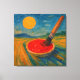 Den här levande surrealistiska digitala målningen har en enorm målningspensel som planterats vid en halverad röd vattenmelon, som slår samman natur och kreativitet i en lekfull, drömliknande sammansättning. En stor gult sol blazar i ett texturerat, blåstrejkat himmel, som kastar värme över ett vidsträckt, minimalistiskt landskap som målas i flytande gröntar, blåsor och . Scenen blandar stollig med ett symboliskt djup, vilket antyder en värld där skapande och verklighet är oskiljaktigt sammanflätade.