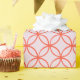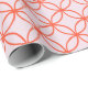 The paper features a large-scale, mid-century modern geometric pattern consisting of overlapping circles that form rounded diamond shapes in the center. The design uses a coordinated mix of muted coral set on a soft pale pink background. Perfect for birthdays, holidays, or everyday gifting, this design adds a joyful pop of color to any present—no extra embellishments needed.