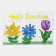 Söt blommor i solrosor av gyllene gulter, daisy av blå gult och lila-tulp i blomning med löv av grönt i trädgårdsgräset. Hej Sunshine skrivet i ett skript med gyllene gulter mot en vit bakgrund. Originalteckning av TamiraZDesign.