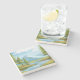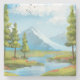 Handmålat soligt landskap med berg i bakgrunden, stil