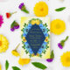 Uppsamling av sunny citron bröllop med blå vilda blommor och ro med botaniskt grönt