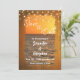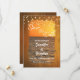 En vacker strand vid solnedgången är inramad av rustiskt trä med en återspegling av solnedgången på den. String ljus överst ger en extra glöd. Penselskripttypografi meddelar Spara datum. De kommande datumuppgifterna för bröllop kan lätt vara personlig.