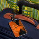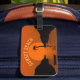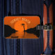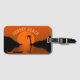 Tröghetskonst för orange och svartvit tropisk strand. Silhouettes av svarta berg, handflatan träd och liten båt som reflekteras i havet ställs mot en ljusstark orange solnedgång med valfri text.