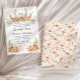 Design feature hand-painted watercolor florals in warm sunset hues of orange, red, and soft greens. A vibrant blossoms floral crest with monogram. The typography used is a elegant calligraphy script with traditional serif fonts. The back of the invitation continues the nature-inspired theme with a delicate floral pattern.