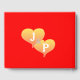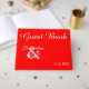 Romantiska solstrålar i gyllene gult till rosa hjärtan på rött. Anpassa med bruden och brudgummens första namn och dejt bröllop i vitt skript på framsidan. Anpassa bok med två hjärtan och parets monogrammade initialer inskrivet. Vår Kärlek-berättelse står på sidan. Ursprunglig teckningsdesign av TamiraZDesign.