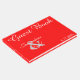 Romantiska solstrålar i gyllene gult till rosa hjärtan på rött. Anpassa med bruden och brudgummens första namn och dejt bröllop i vitt skript på framsidan. Anpassa bok med två hjärtan och parets monogrammade initialer inskrivet. Vår Kärlek-berättelse står på sidan. Ursprunglig teckningsdesign av TamiraZDesign.