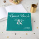 Romantiska solnedgång i skuggor av guldfärgad orange av gult på söt, fast grönt av teal baksida. Anpassa med bruden och brudgummens första namn och dejt bröllop i vitt skript på framsidan. Anpassa bok med två hjärtan och parets monogrammade initialer inskrivet. Vår Kärlek-historia är skriven på ryggraden i bok. Låt gästerna i bröllop skriva under er gäst i bröllop bok som en underbar keepsaké bok. Ursprunglig teckningsdesign av TamiraZDesign.