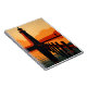 A bold and serene illustration of a lighthouse at sunset, captured in warm orange and red tones. The design features strong silhouettes of a lighthouse, pier, and distant watchtower, reflecting over calm water with a graphic, vintage-inspired style. Ideal for lovers of coastal scenes and retro aesthetics.