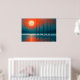 Tall trees stand silhouetted against a vibrant sunset, their reflections mirrored in the tranquil water below. The strong contrast between the warm sun and the cool blue tones creates a striking visual effect.