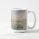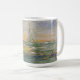 Målade sjölandskapet med segelbåten sedd från stranden. vackra blues och gröntar i vatten med en strålande solnedgång av och orangar. Design fungerar som väggkonst, stationär och många hemdekorobjekt.
