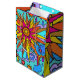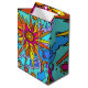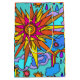 Orange, pink and yellow sunburst above a blue and lavender cloudy sky. Rainbow below a blue cloud with colorful raindrops.