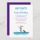 Tonåring födelsedagsfest inbjudan med en unik illustration. Aqua Blue och lila färg med malltext. Stor text för party och flickans namn och ålder. Party-texten är lätt att anpassa, i styckeform, efter party behov. Arbetar för en strand party med vatten sport, eller en samling vid en uthyrningsfirma för SUP. Lägg till mellanslag efter behov. Min egen "tjej med hund på en padleboard"-design finns vid grund i inbjudan. Hon paddlar i tropiska sköldpaddor i vatten som en havssköldpadda simmor bredvid. Omvänd är solid mörks lila.