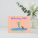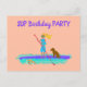 Tonårsflickors födelsedagsfest inbjudan vykort med en paddleboard tema. Illustrerad design visar en flicka paddla sin bräda med sin hund ombord, när en havssköldpadda simmar bredvid. Anpassa malltexten på framsidan och baksidan för en rolig fest. Postadress kan läggas till separat till varje fest inbjudan.