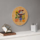 Large Round Wall Art Clock and home furnishing decor accessory with Super Cute Scarecrow artwork design illustration by TheFabricSeal at Zazzle.com. Fall Season, Thanksgiving and Halloween are all great times of the year. This adorable whimsical drawing with a super cute scarecrow with a silly grin, pumpkins and sunflowers was a lot of fun to create. The scarecrow has a wonky orangish red baseball hat, brown sweater, blue pants, straw hair, hands, feet and body. Gorgeous yellow sunflowers with their delicious sunflower seeds growing on tall flower plant green vines and leaves plus several yummy looking orange pumpkins complete this fun and whimsical farm scene.