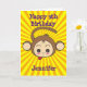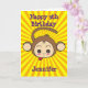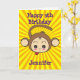En illustration av en apa ansikte med rodnande kinder och hans tunga sticker ut. Ser söt och kawaii ut. Bakgrunden är ett glatt gult och orange mönster med solstrålar som sprutar ut runt apan som gör honom super kraftfull. Anpassningsbar födelsedags kort med ett meddelande inuti.