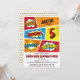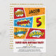 Fira din superhjälte med fantastisk födelsedagsfest inbjudan med all din party-information mot en tecknad som liknar en remsliknande bakgrund. Perfekt för barn som kärlek superhjälte och tecknad bokar.