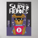 Söt affisch för barnkammaren. Illustration av en hund i superhjältekläder med bokstaven "D" på bröstet. Texten ovanför säger "Alla superhjältar sammankallas". Man kan se stadssiluetten i bakgrunden.