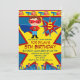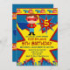 Superhjälte-inbjudningsmall för pojkars födelsedagsfest med röda, blå och gula serietidningsfärger. Dessa söta superhjälte-inbjudningar har en superhjältepojke som står med händerna på höfterna med en blå cape som flyger i vinden, en röd ögonmask och en hjältekostym med ett "S" på bröstet för Superhjälte. Bredvid den stora superhjältekaraktären finns en stjärnexplosion i rött och blått med ditt barns ålder. Den övre kanten på inbjudan har superhjältar som flyger över inbjudan på en bakgrundsflagga i gult och rött. Den nedre kanten har superhjältar som står på taket av byggnader längs stadens siluett ritad i blått. Inbjudningstexten är centrerad inuti en stor gul stjärnexplosion. Baksidan av inbjudan har också en fullfärgad superhjälte och en annan stjärnexplosion i gult och rött, med ditt barns ålder, tillsammans med kanter av flygande hjältar. Bakgrunden på denna inbjudan är blå. Teckensnittet för inbjudningstexten är rött och blått i en serietidningsstil. Dessa är söta och starkt färgade inbjudningar för pojkar som älskar superhjältar eller serietidningsfigurer. Skriv bara in din information om barn
