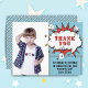 Superhjälte Serietidning Pratbubbla Pojke Foto Födelsedags Tacksam Julkort. Lägg till ditt foto, meddelande och namn. Roligt tecknat födelsedags tacksam julkort för pojkar.