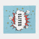 Superhjälten Tecknad Tal Cloud Boy Namn Fleece Blanket. Filten är en ljus och glad blått, försedd med lekande stjärnor för gult för en roligt. Den här filtrets utfallsfunktion är molnet tecknad tal, som kan anpassas med barnets namn för en unik och personlig beröring.