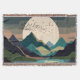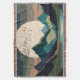 Ett abstrakt av en massiv supermåne i ett bergsområde sjö med en flock av fåglar i fet struktur och mörk med bruna, beige, tan, blått, cyan och svart toner.