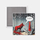 A bold red wolf and Little Red Riding Hood stand opposing each other where fear is expected, in a minimalistic, eerie forest.